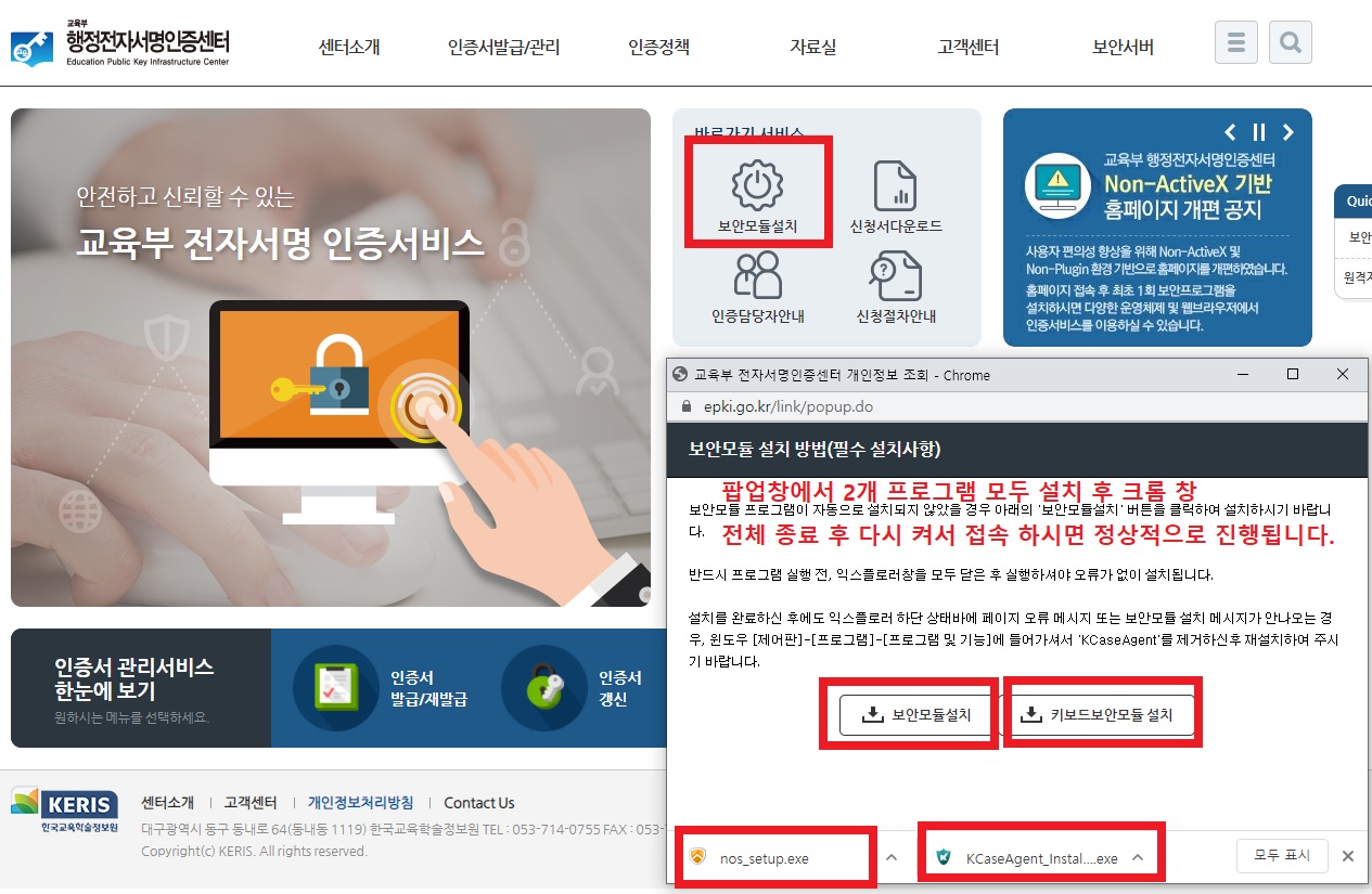 교육부 행정전자서명인증센터로 접속 후 보안모듈을 설치하여 해결하실 수 있습니다.